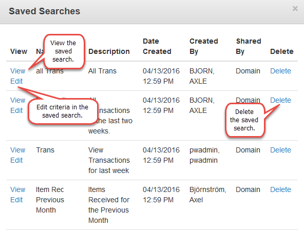- Click View to run a saved search.