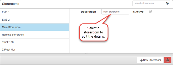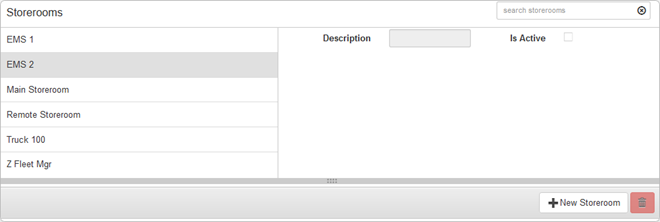 The Storerooms panel lists all of the existing storerooms on the left side of the panel and on the right shows the storeroom details. The details cannot be edited unless a storeroom has been selected. You can filter this list by typing the first few letters of the storeroom in the search box in the top-right corner of the panel.