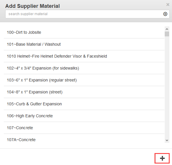 - Select the desired materials and click the plus icon. You can filter this list by typing the first few letters of the supplier in the search box at the top.