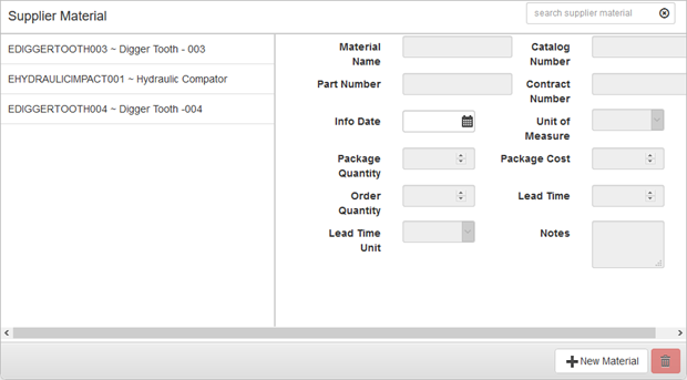 - Select the material in the Supplier Material panel to view or edit the information as needed.