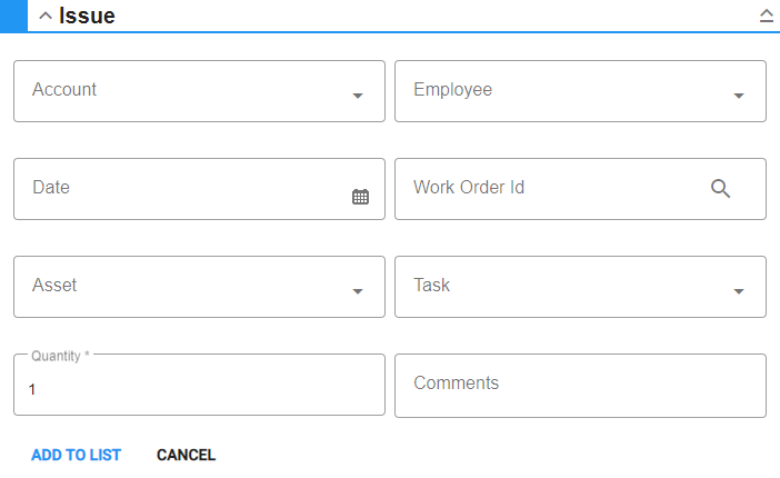 Issue is used to track inventory as materials are distributed for use. This also issues materials from a storeroom and assigns them to work orders (and entities), accounts, and/or employees.