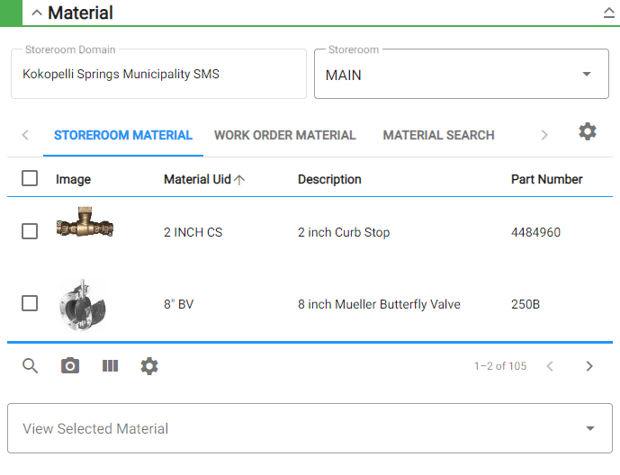2. On the Material panel, select a Storeroom from the drop-down list. This changes the list of materials. Materials can only be selected from one storeroom at a time.