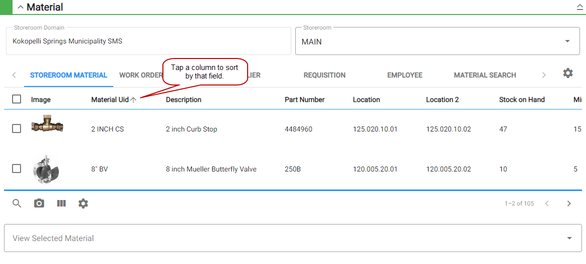 You can also tap a column in the material list to sort the list by that field on the Storeroom Material, Work Order Material, Supplier, Requisition, or Employee tabs.