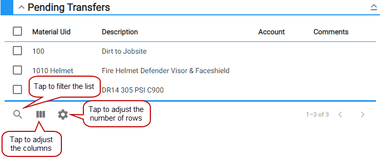 - Tap Rows to adjust the number of rows shown in the panel. The number set in this panel will persist on all other transaction pages for the corresponding pending material panel.