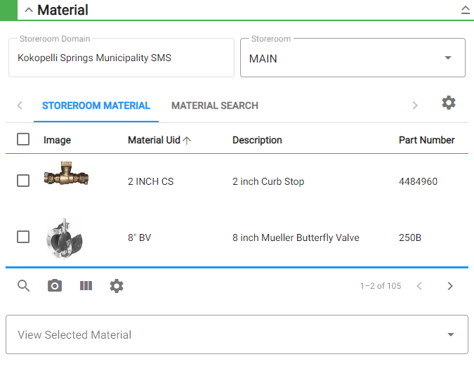 - On the Material panel, select a Storeroom from the drop-down list. This changes the list of materials. Materials can only be selected from one storeroom at a time.