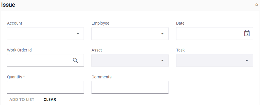 Issue is used to track inventory as materials are distributed for use. This also issues materials from a storeroom and assigns them to work orders (and entities), accounts, and/or employees.