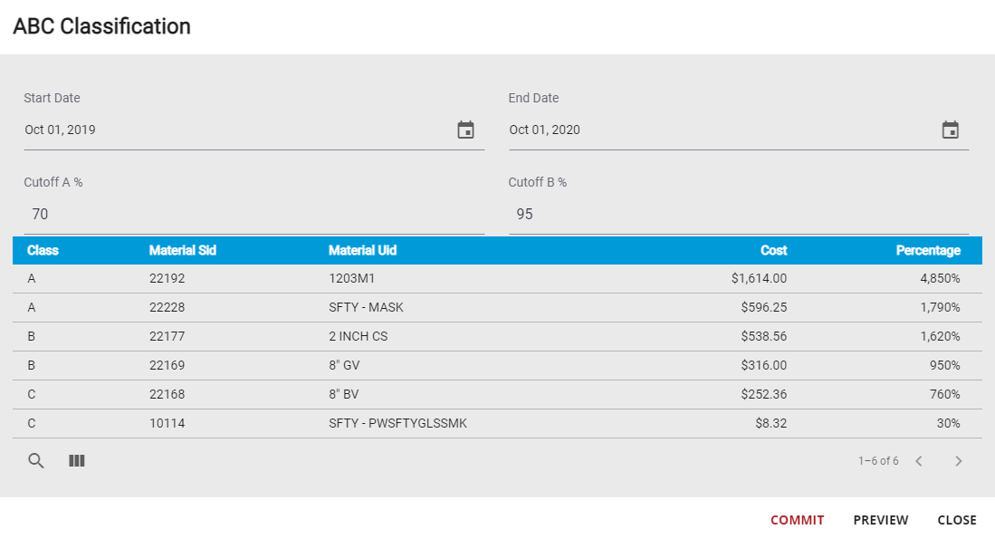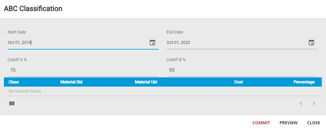 - Enter the Cutoff A %. Class A is usually composed of the top 10% materials that generates 70% of the material costs. This field automatically defaults to 70.