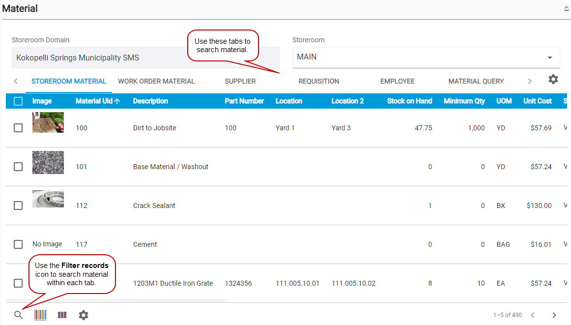 In this panel, you can view or search materials using the Storeroom Material, Work Order Material, Supplier, Requisition, Employee, and Material Search tabs. The search tabs will vary based on which transaction window is open. You can filter the material in the list by tapping Filter records and entering the first few letters or numbers of the material name, bin location, or part number.