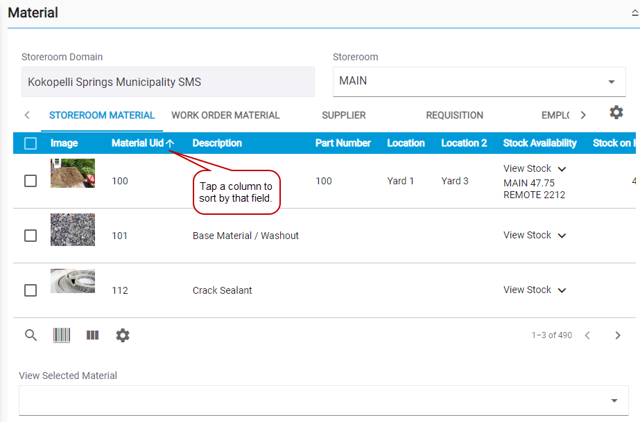 You can also tap a column in the material list to sort the list by that field on the Storeroom Material, Work Order Material, Supplier, Requisition, or Employee tabs.