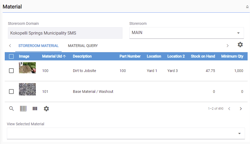 - On the Material panel, select a Storeroom from the drop-down list. This changes the list of materials. Materials can only be selected from one storeroom at a time.