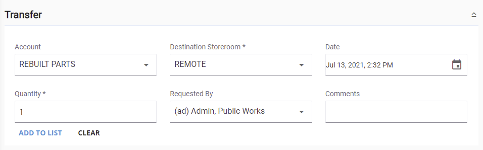 - If you would like to add other materials to this transfer transaction, tap Clear in the Transfer panel to clear the fields, then add another material to the list.