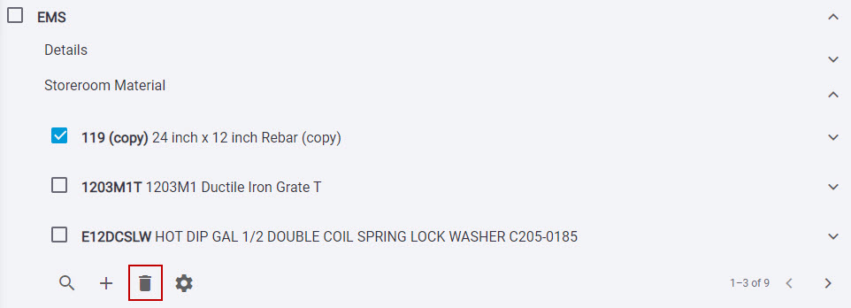 • If the Stock for the material is greater than 0, then the material cannot be deleted from the storeroom. The material must be transferred to another storeroom or removed entirely. See Transfer Material or Remove Material for more information.
