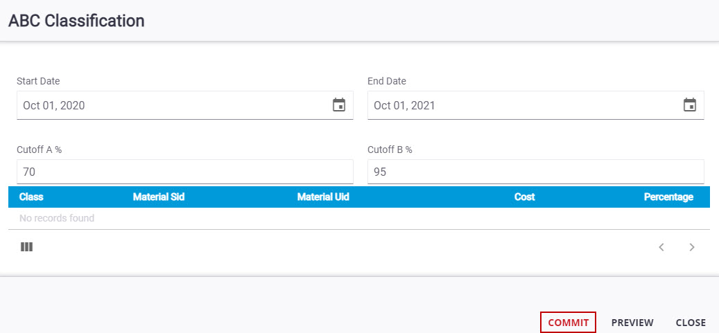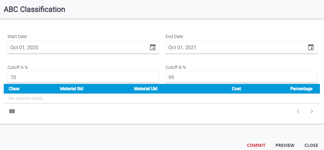 3. Enter the Cutoff A %. Class A is usually composed of the top 10% materials that generates 70% of the material costs. This field automatically defaults to 70.