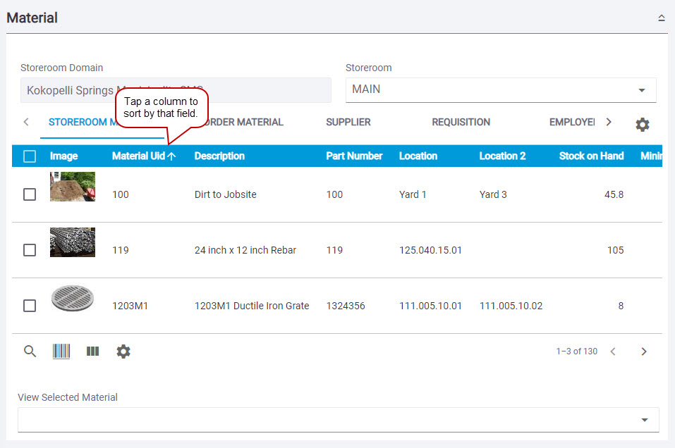You can also tap a column in the material list to sort the list by that field on the Storeroom Material, Work Order Material, Supplier, Requisition, or Employee tabs.