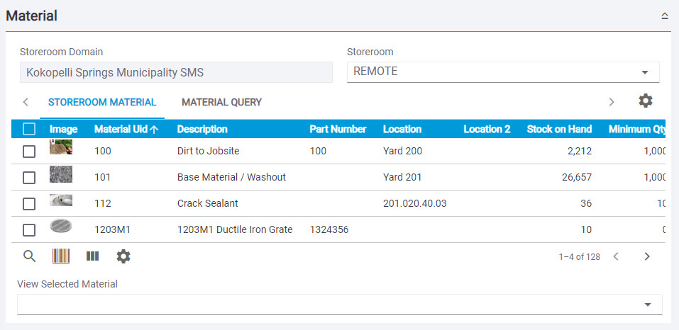 2. On the Material panel, select a Storeroom from the drop-down list. This changes the list of materials. Materials can only be selected from one storeroom at a time.