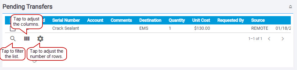 • Tap Rows to adjust the number of rows shown in the panel. The number set in this panel will persist on all other transaction pages for the corresponding pending material panel.