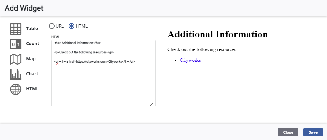 The HTML widget displays media from external online sources using either a URL or HTML.