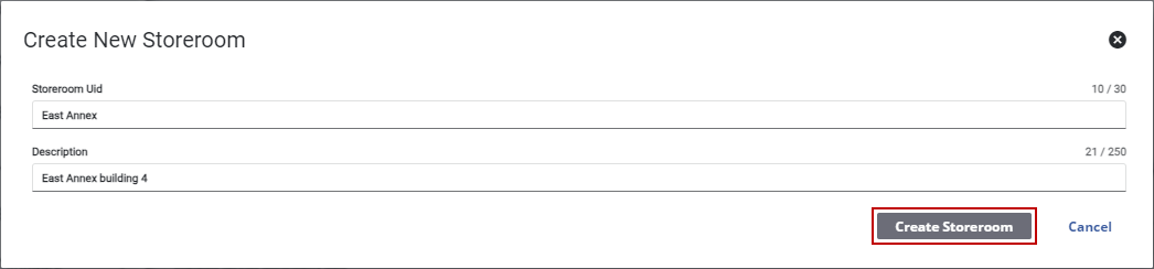 - On the Create New Storeroom panel, enter the Storeroom Uid and Description.