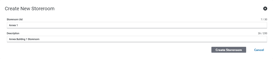 - On the Create New Storeroom panel, enter the Storeroom Uid and Description.