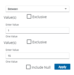 • Between: Select to search for a single number or for any numbers contained between a set. For example, return any amounts between 100 and 500.