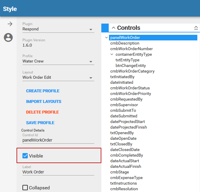 - In the Control Details section, select the Visible check box to make the control visible or click to clear the check box to make the control hidden.