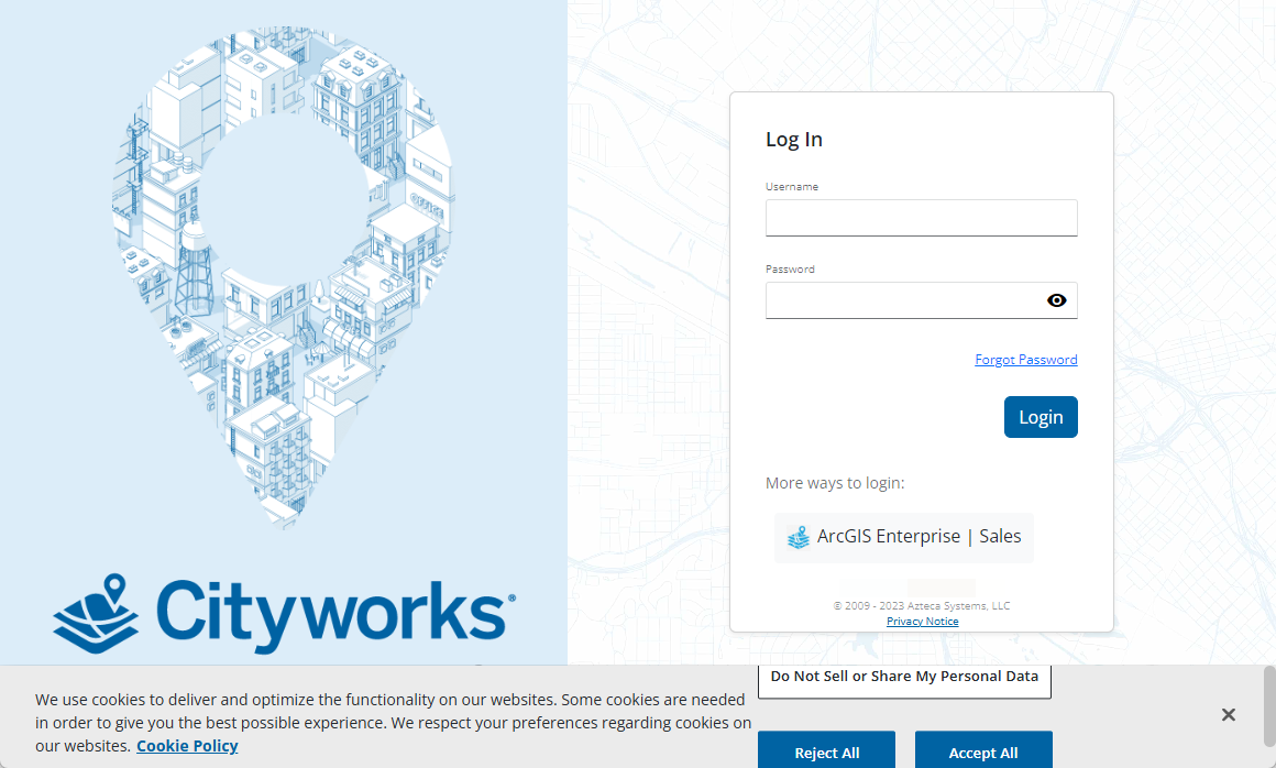 Use the login page to access Cityworks apps, such as Style or scan a QR code to download the mobile apps. If you are an administrator, you can manage connection strings as well as complete limited app management. For more administrative functionality, see the topics under the Manage the Admin Plugin in the Admin 3.5 Guide for more information.