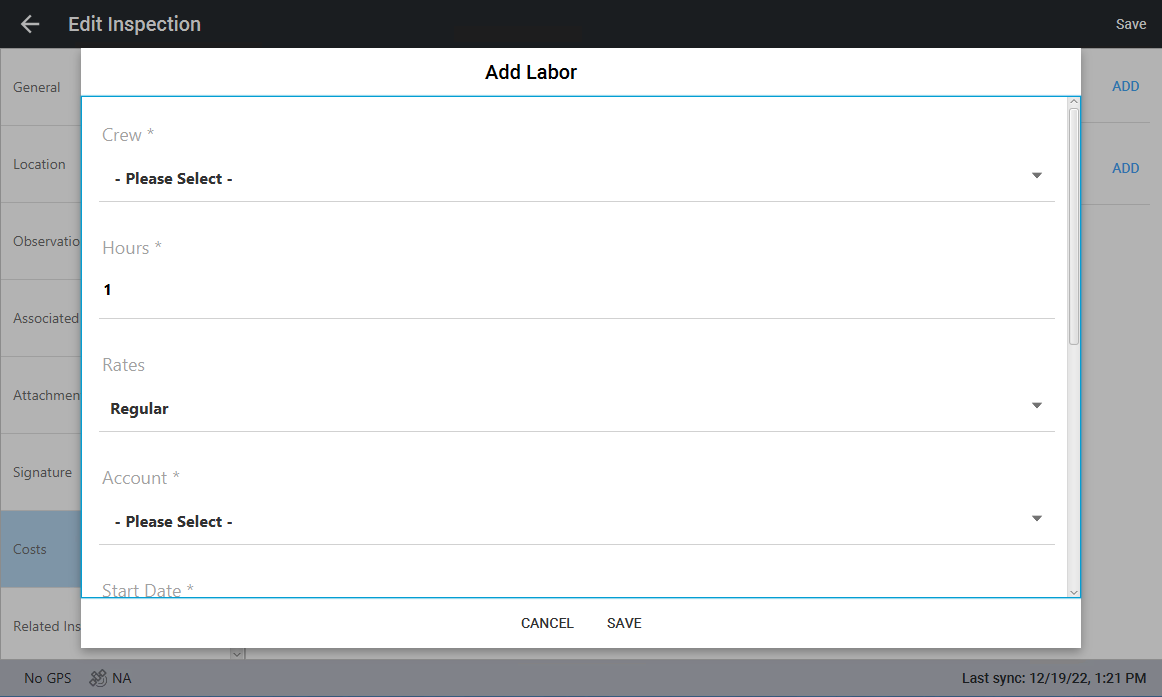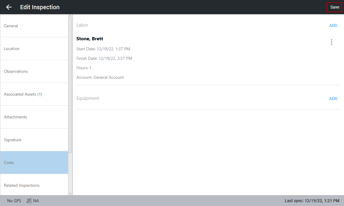- Click Save in the top-right corner to save the labor to the inspection.