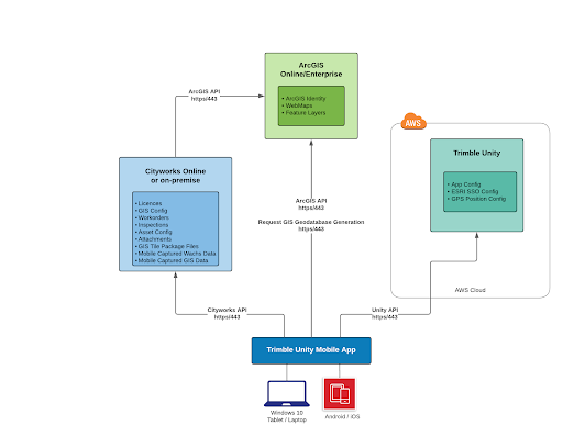 See the diagram below which depicts the deployment and the initiation of requests by the Trimble Unity mobile app to the required network entities. All requests are performed over HTTPS (port 443).