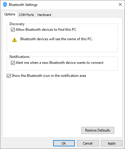 - Select the check box for the Allow Bluetooth devices to find this PC option, then tap OK.