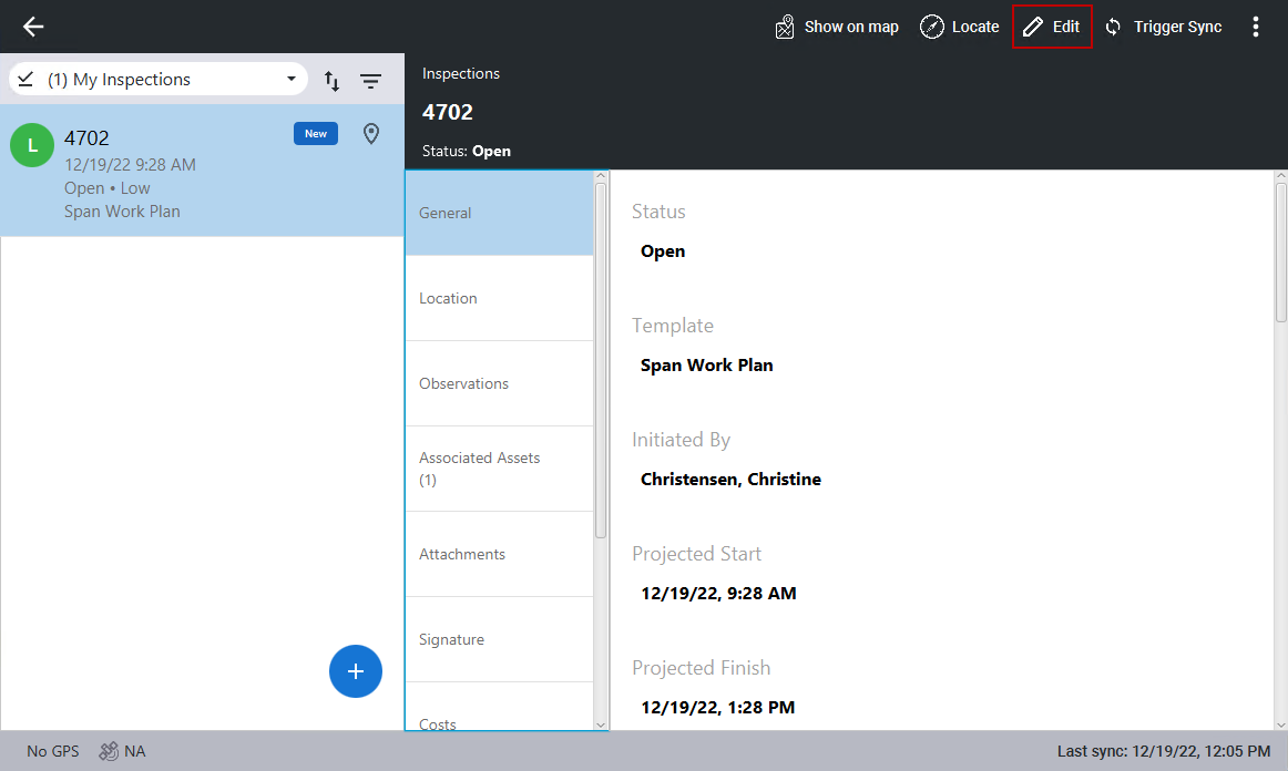 The General section contains general information about the inspection, including who it is assigned to, the projected start date, the status, and the location.