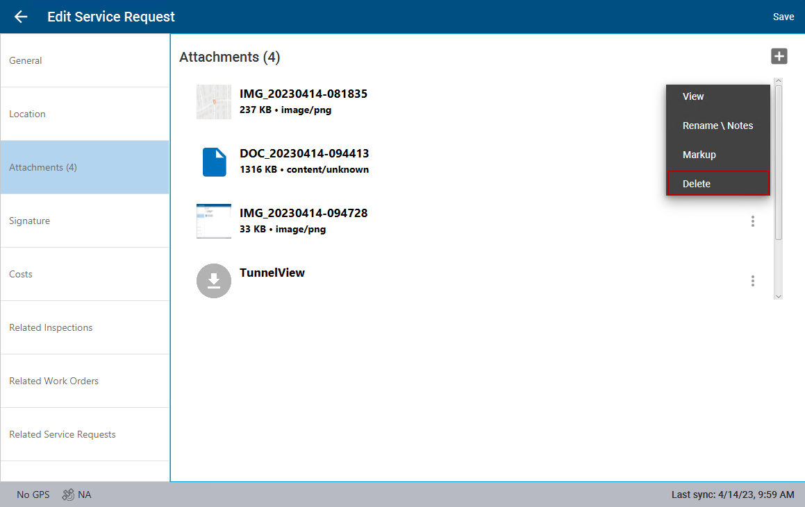 Attachments can be removed from service requests in the Trimble Unity mobile app and then the changes are reflected in Cityworks.