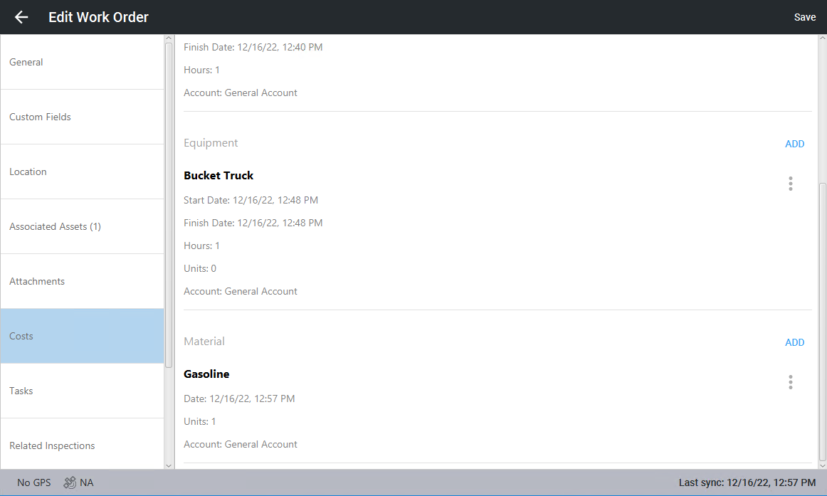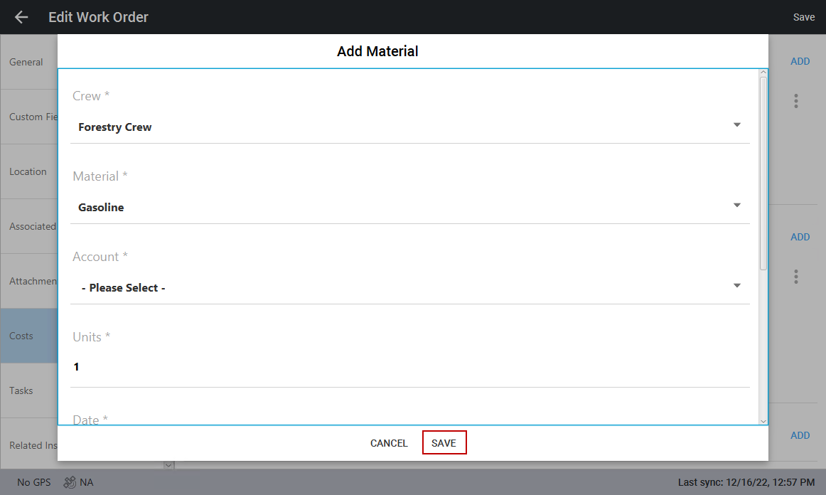 - Click Save in the top-right corner to save material to the work order.
