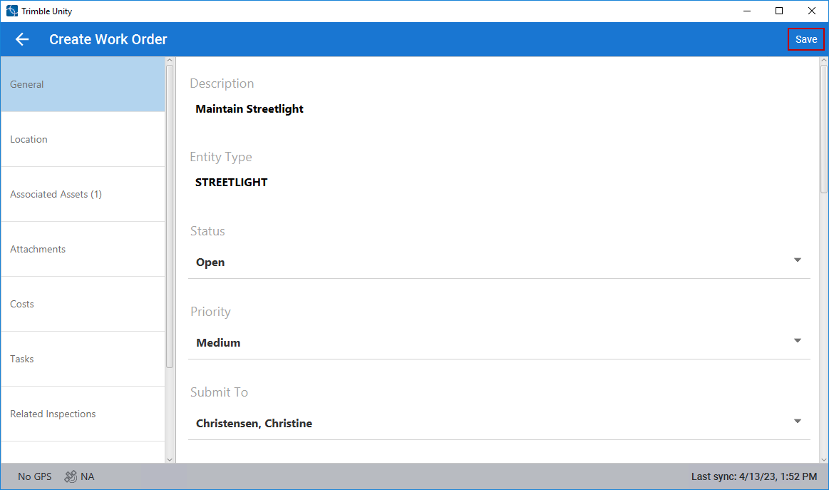 - Enter any work order information and click Save.