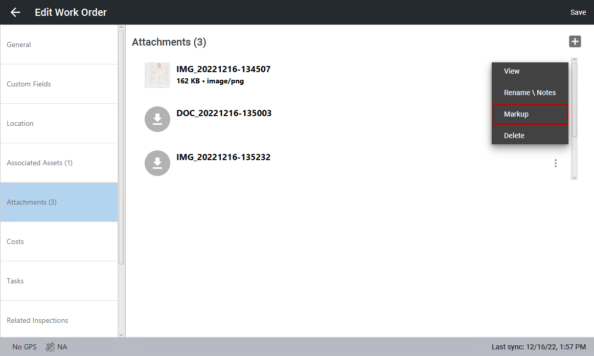 Users can mark up or redline existing attachments or when adding new attachments to work orders in Trimble Unity Mobile. These changes are reflected in Cityworks.