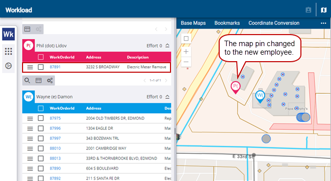 Now that the work order is assigned, the Submit To on the work order changes to the new employee, and the map pin changes to the new employee.