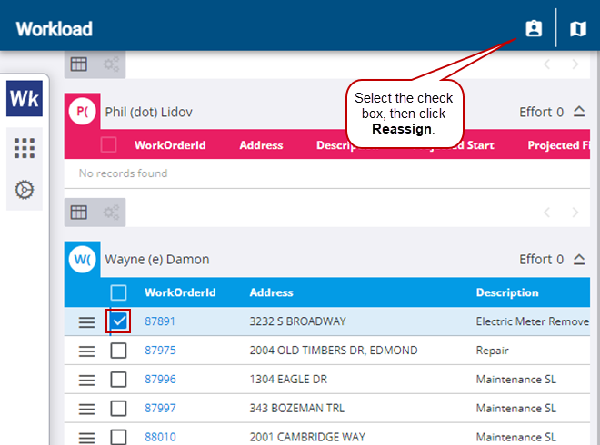 - Click a work order check box and click Reassign. Click multiple check boxes to reassign multiple work orders at the same time.