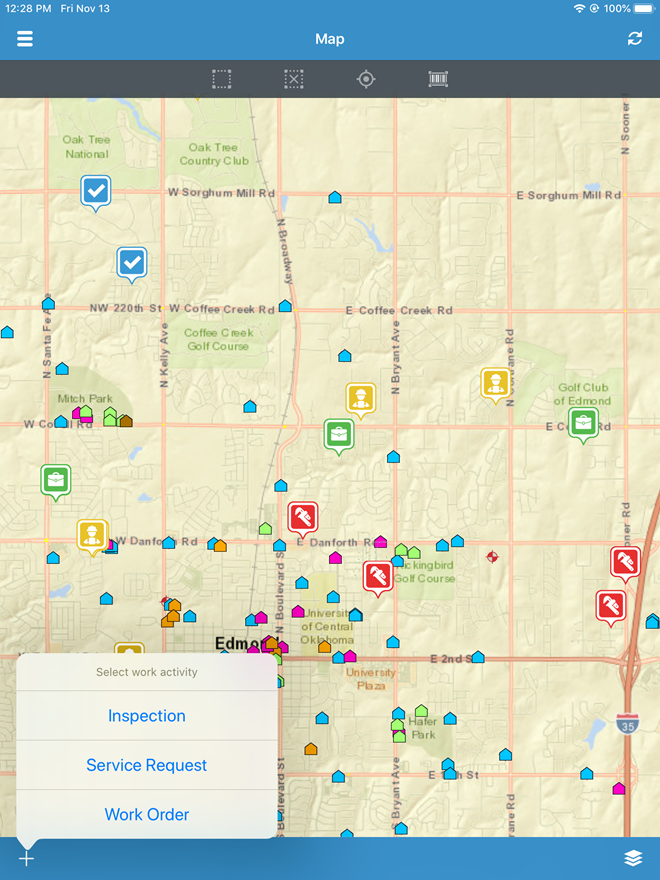 - From the map, tap the add icon in the lower-left corner and tap Work Order on the Select work activity window.