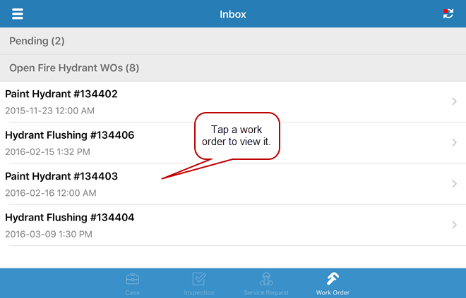 A list of work orders appear, grouped by saved searches and pending work orders that need to be synced, or in one single list if no saved searches have been added to the mobile inbox.