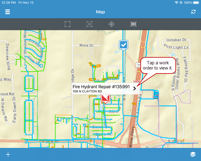 - Tap a work order icon on the map, then tap the arrow on the description that displays.