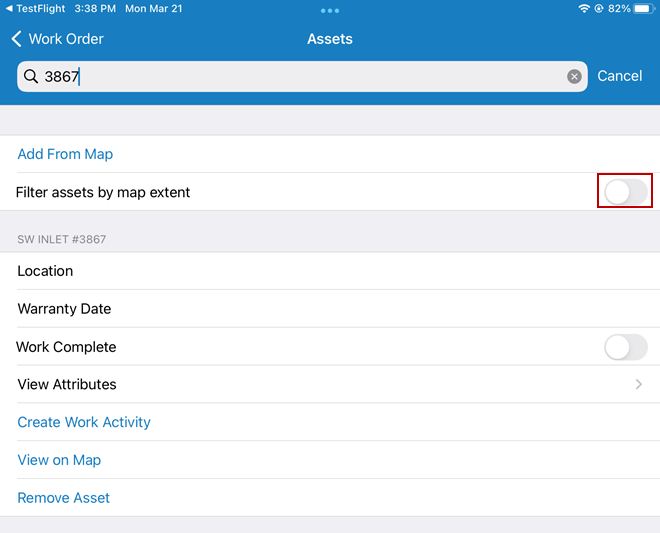 - Tap the Filter assets by map extent switch to filter assets on the map.