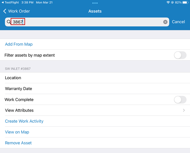 When the map extent is zoomed in or out, only the attached assets found within that extent are listed on the work order.