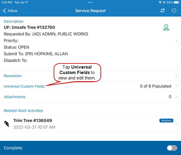 Universal Custom Fields displays any universal custom fields associated with the service request.