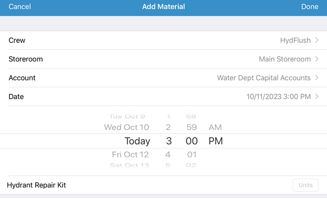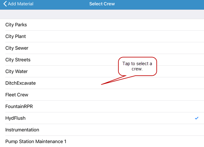 • You must configure the crew before you can add material using the iOS app. See Add or Edit a Crew in the Admin 3.3 Guide for more information.