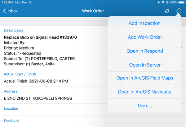 When you are viewing a work order in the mobile apps, you can open it in ArcGIS Field Maps to view the location, update GIS data, or use ArcGIS Tracker.
