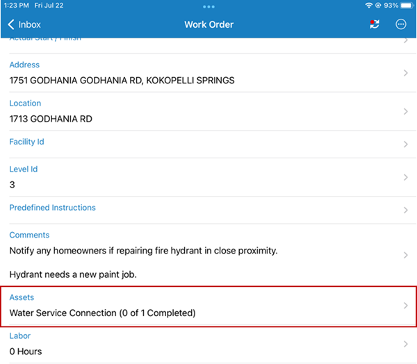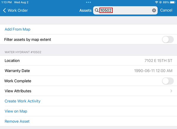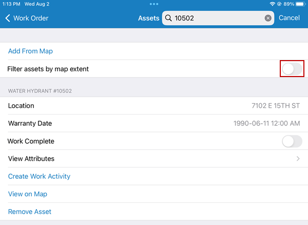 When the map extent is zoomed in or out, only the attached assets found within that extent are listed on the work order.